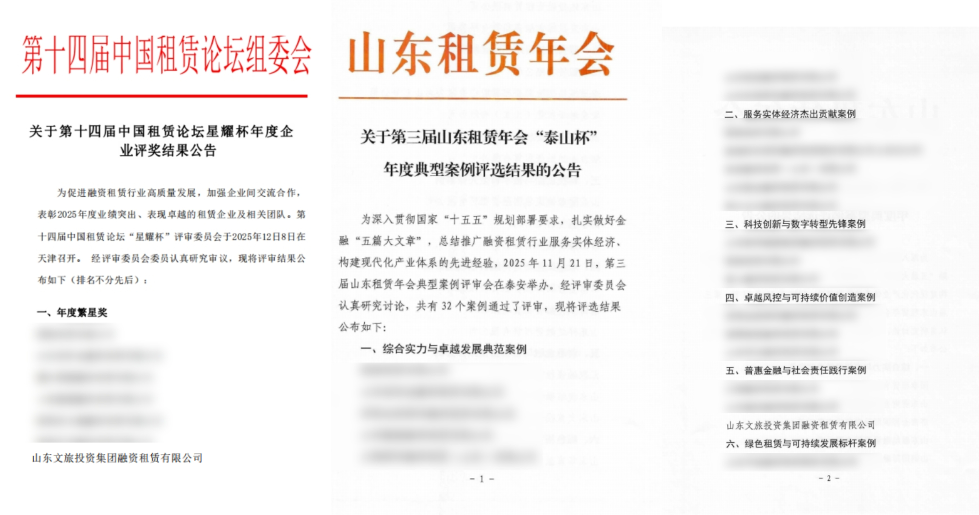 近日,山東省融資租賃行業(yè)協(xié)會(huì)與中國(guó)租賃年會(huì)評(píng)審委員會(huì)相繼發(fā)布了《關(guān)于第三屆山東租賃年會(huì)“泰山杯”年度典型案例評(píng)選結(jié)果的公告》與《關(guān)于第十四屆中國(guó)租賃論壇星耀杯年度企業(yè)評(píng)獎(jiǎng)結(jié)果公告》。經(jīng)評(píng)審,山東文旅投資集團(tuán)融資租賃有限公司(以下簡(jiǎn)稱(chēng)“山東文旅租賃”)憑借在文旅金融領(lǐng)域的創(chuàng)新實(shí)踐與扎實(shí)業(yè)績(jī),成功入選第三屆山東融資租賃年會(huì)“泰山杯”典型案例與第十四屆中國(guó)租賃年會(huì)“年度繁星獎(jiǎng)”,實(shí)現(xiàn)了在全國(guó)性行業(yè)平臺(tái)與區(qū)域?qū)I(yè)領(lǐng)域的雙重認(rèn)可。