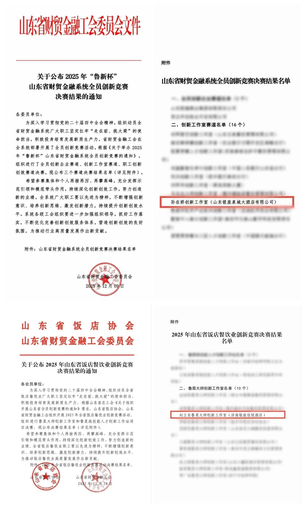 在山東省財貿金融工會公布的2025年“魯新杯”山東省財貿金融系統(tǒng)全員創(chuàng)新競賽決賽結果通知中,泉城大酒店“孫在嬌創(chuàng)新工作室”躋身創(chuàng)新工作室賽道獲獎名單;在山東省飯店協(xié)會、山東省財貿金融工會組織開展的2025年山東省飯店餐飲業(yè)創(chuàng)新競賽決賽中,濟南佳悅酒店“劉衛(wèi)東魯菜大師創(chuàng)新工作室”入選魯菜大師創(chuàng)新工作室名單。