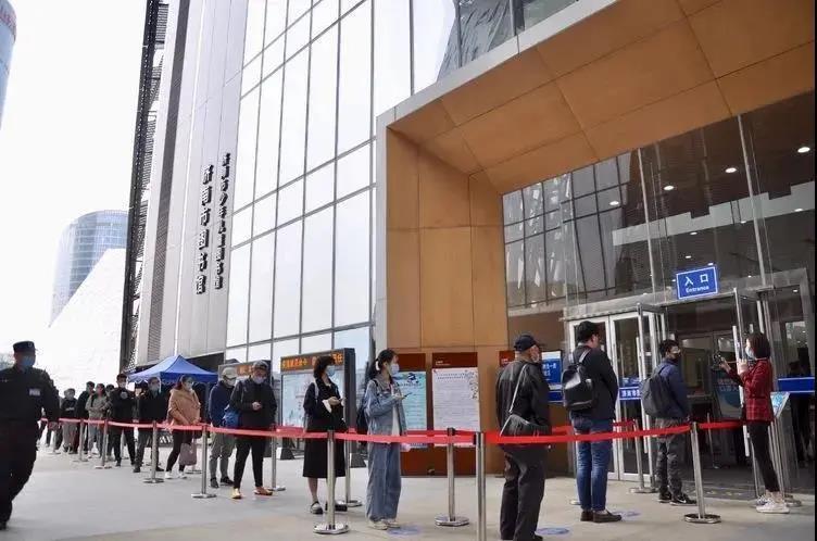 讀者在濟(jì)南市圖書館門口有序排隊(duì),準(zhǔn)備入館