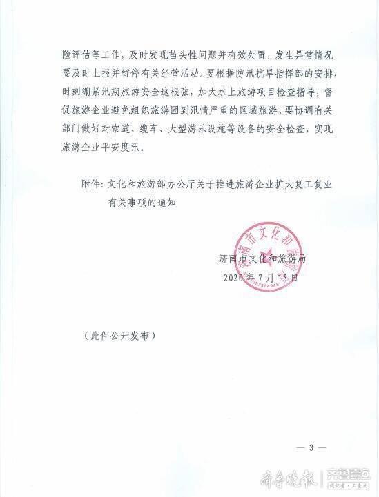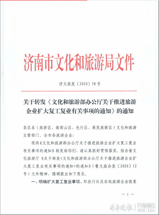 7月15日,濟(jì)南市文化和旅游局印發(fā)《關(guān)于轉(zhuǎn)發(fā)<文化和旅游部辦公廳關(guān)于推進(jìn)旅游企業(yè)擴(kuò)大復(fù)工復(fù)業(yè)有關(guān)事項的通知>的通知》,明確指出旅行社及在線旅游企業(yè)恢復(fù)經(jīng)營跨省(區(qū)、市)團(tuán)隊旅游及“機(jī)票+酒店"業(yè)務(wù),游客量由不得超過最大承載量的30%調(diào)至50%。